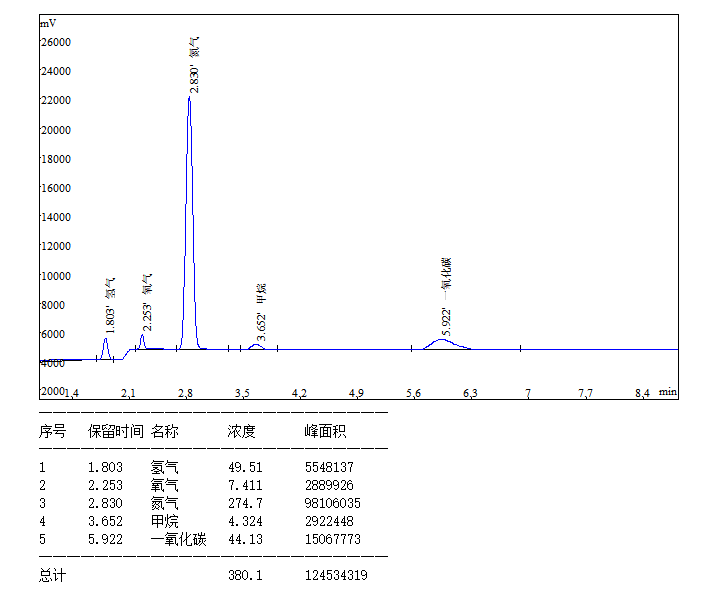 二氧化碳中氫氣 一氧化碳 氧氣 氮氣 氦離子化檢測譜圖